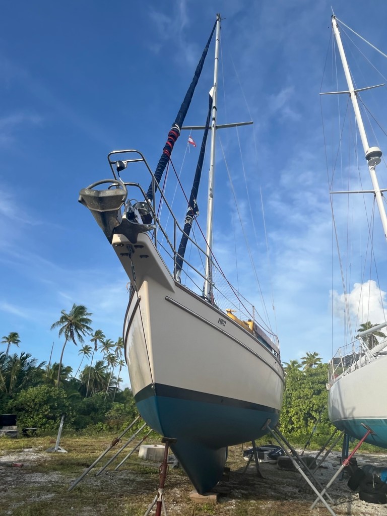 It feels so good to be back to my boat after 6 months of being away! From seeing family and friends, mountain biking in New Zealand, skiing and ice plunging in Tromsö, walking my dog and cycle touring in the UK and much more, I have arrived back to Apataki with 62 kg of boatparts. The boatyard is empty but that’s about to change as people are starting to arrive to prepare for the sailing season. Lots of people have asked me if the boat was in good condition when I arrived. I was pleasantly surprised to find the boat without mould, odd smells and being dry. No major clean up was needed and I could get to work right away. After replacing the inverter, the waste pump, the traveller, the head sails and odds and ends, I’ve booked to haul Sarantium back in the water. If all goes well, I will again be floating in the turquoise water in French Polynesia. 🥰