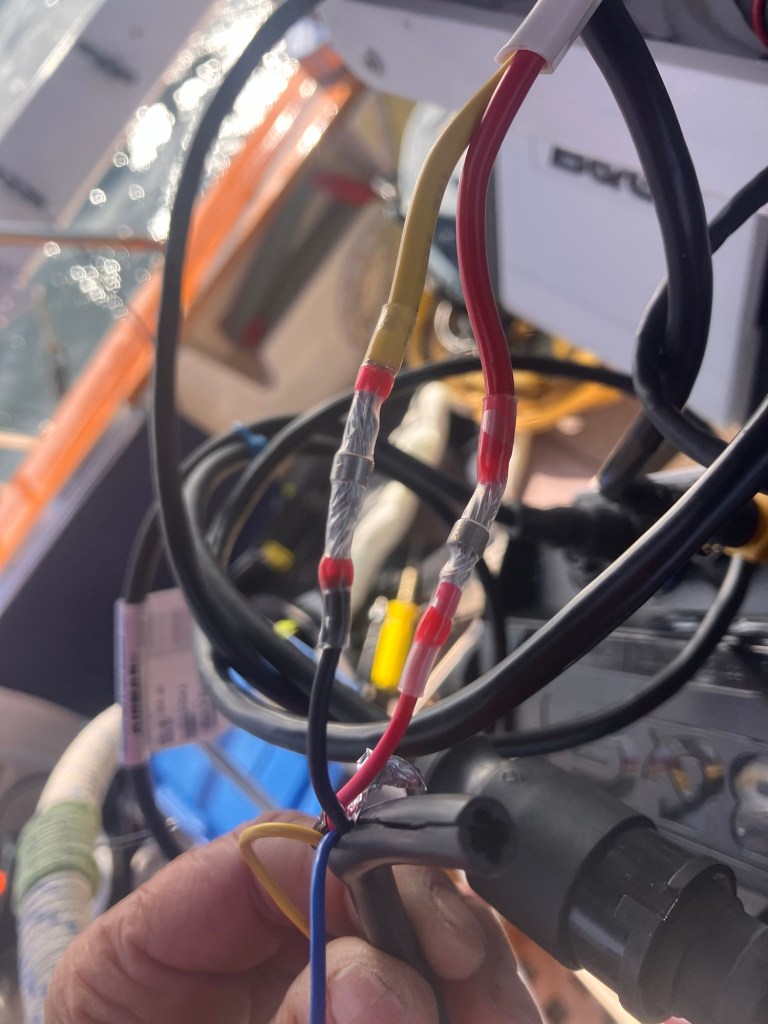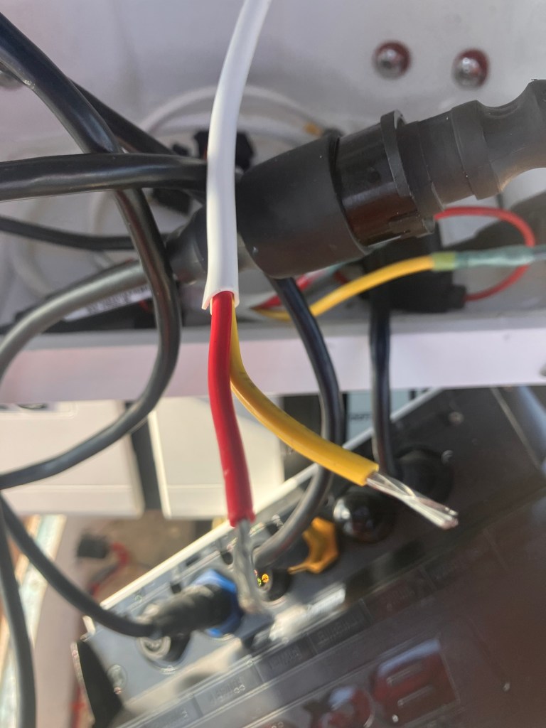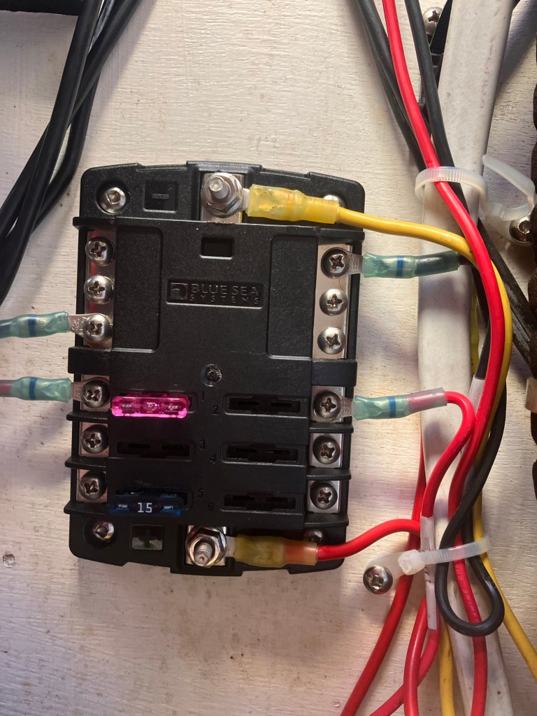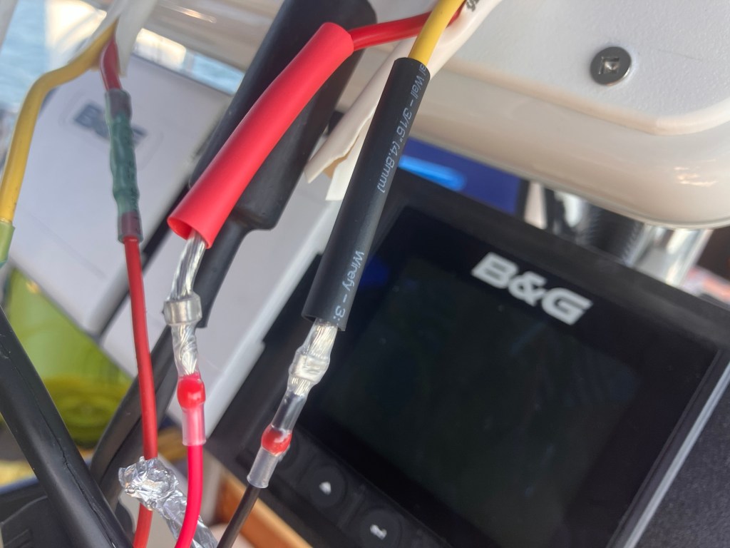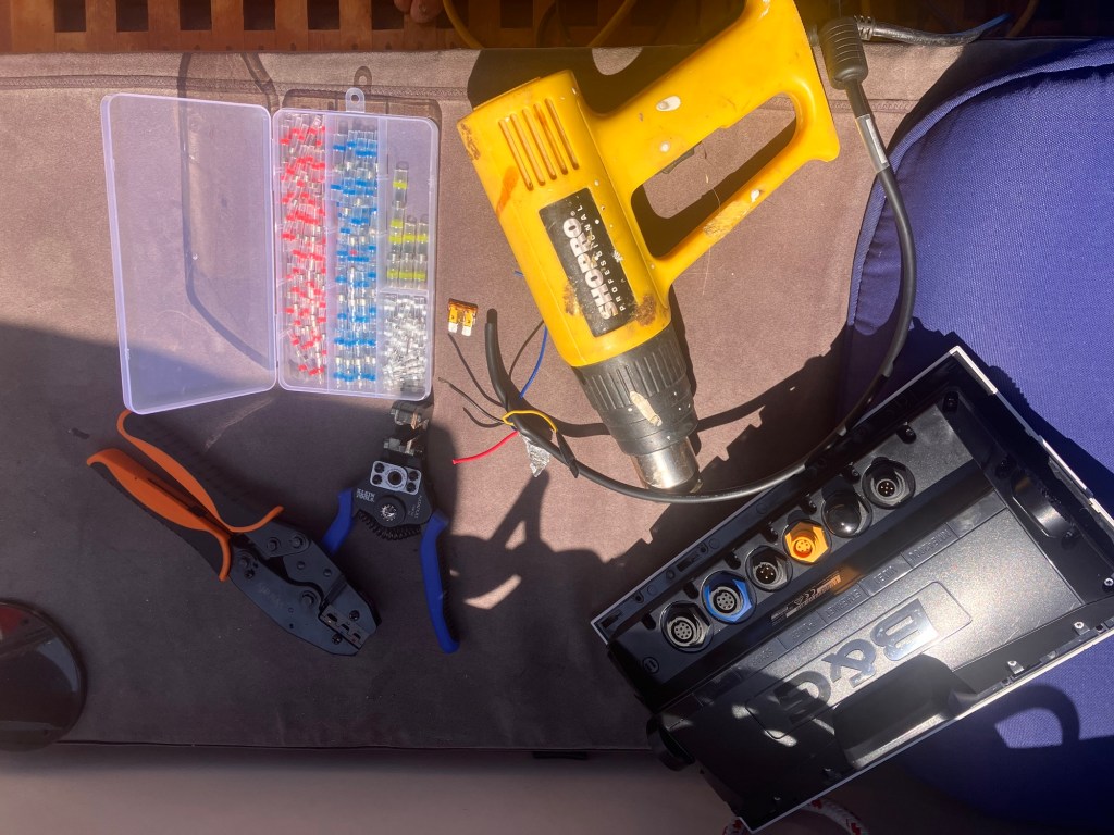 Then the trouble shooting began! I checked for loose connections and blown fuses! Sure enough a fuse was blown! I replaced it, but the new one also blew! Ok, now there is a problem. So I researched and called around to get some advice! Two days of further trouble shooting and taking the chart potter to a marine store, no answers and I was still scratching my head! Someone said “try putting in a 5 amp fuse instead of the 3 amp”… so I did and it also blew. I must have gone through 5 fuses in total and cut and crimped and rewired cables five times. I’m getting good at using the heat gun and splicing wires! I think the unit is a lemon, so it’s going back on warranty luckily🤞🏼I’ve also traced every wire through walls, floors, helm and boat rails! It’s been an education! Now, it’s beer time🍻