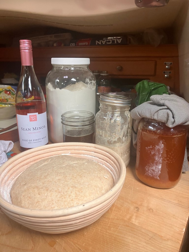 While waiting for hurricane season to be over, prepping for Mexico, we’re growing healthy bacteria for our guts! Sourdough bread is baking, kefir culture is being made, kumbucha is brewing, garlic is pickled and wine is being drank❣️