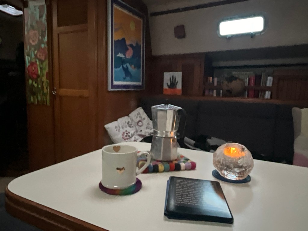 Seems a short distance, sure feels long! Waking up early unaware of my surroundings, as we arrived in fog and in the dark…. I looked outside and thick fog was still present! So I pulled my cozy sweater on, lit a candle, ground some beans, poured my coffee and crawled back under my wool blanket and read my book “Sea People”. No rush getting out today!