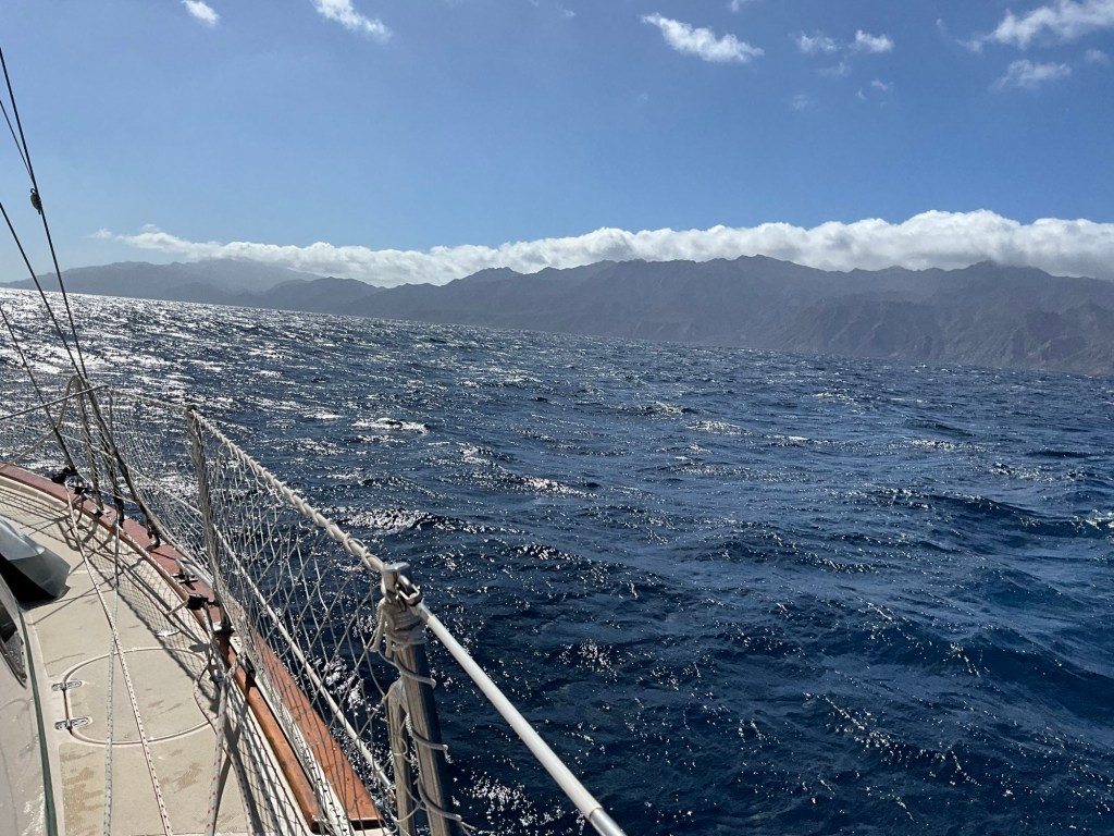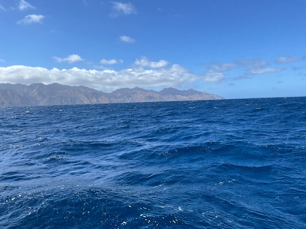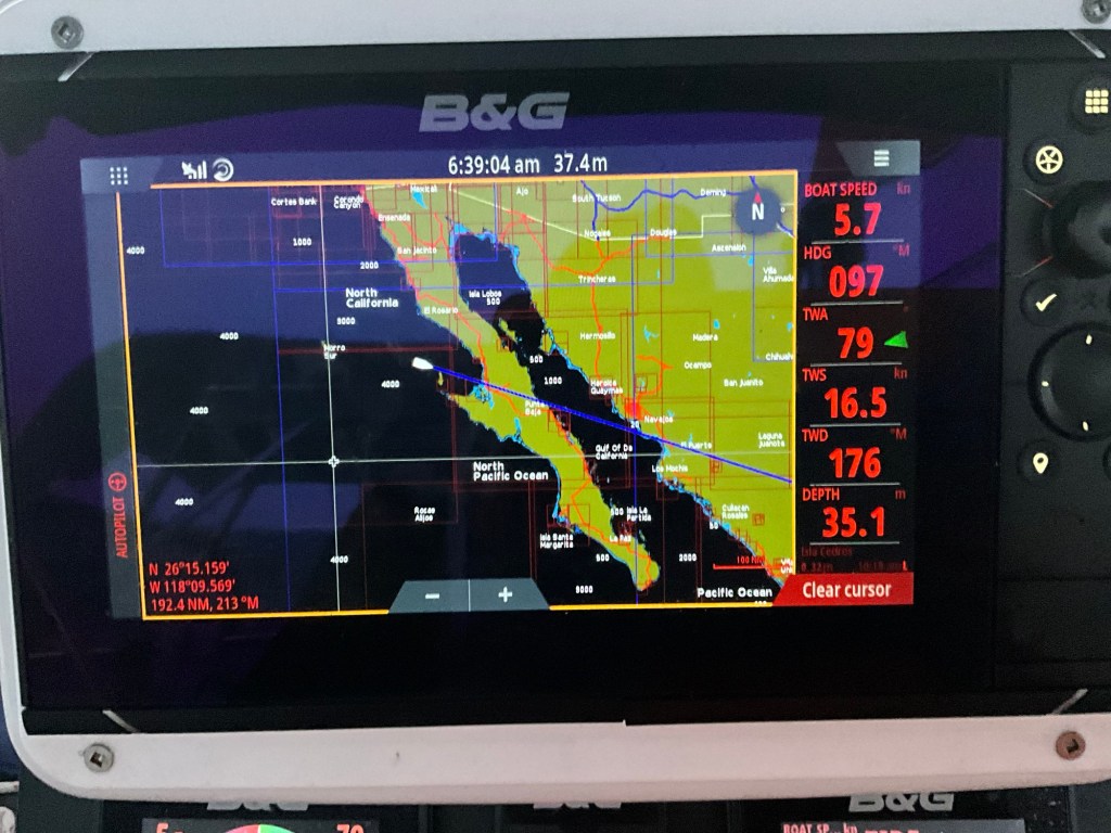 We knew wind and waves were forecasted to be of decent speed and size. According to my garmin GPS inReach weather report, wind was upgraded to 21 nmiles NW and 7 feet wave height, 16 seconds apart. At times I was reading gusts up to 28 nmiles, and when we needed to reef our mainsail and pointing up wind we had 31 nmiles on the nose. Yikes, that’s more than we had anticipated. As well, waves seemed taller and less than 16 seconds apart. Needless to say, it was a lively sail through the night. Since we are two people sharing the helm, we took three hour shifts through the night. Presently, we are three hours away from Isla Cedros and our anchor on the east side to hide from swell and wind. Turtle Bay will have to wait!