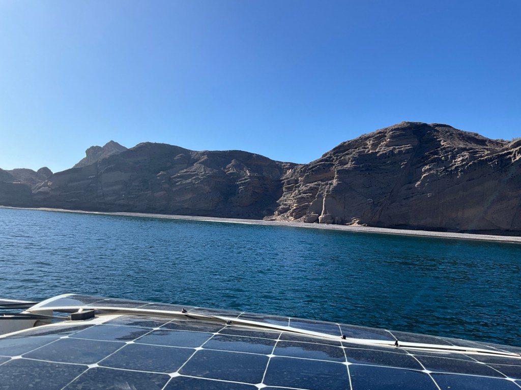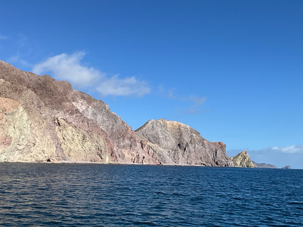 Bahia Salinas is a wide open bay but write-up said we would be protected from all but south wind. North westerlies are prevailing so we took a chance. We shouldn’t! I had a sleepless night! I wanted to leave first light so after coffee and new baked bread with fresh tomatoes, Sarantium motored out to find ZERO wind! I decided to go around the corner to another anchoreage and wait for wind.