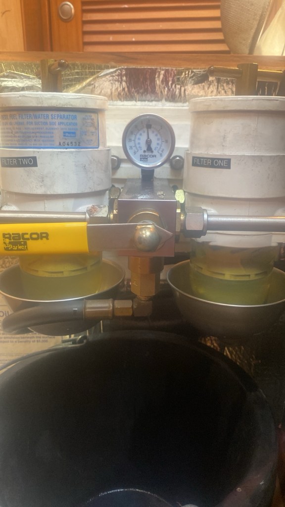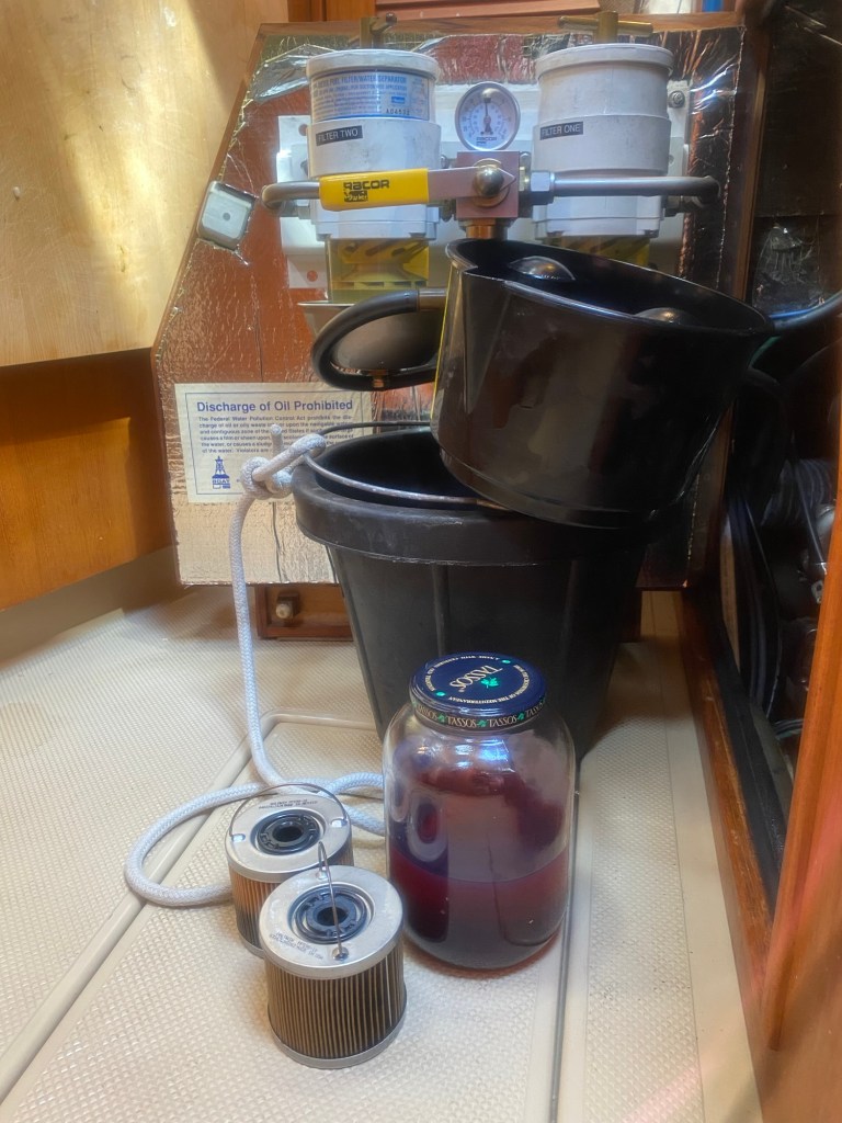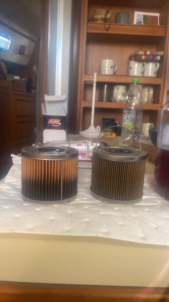 What to do? Let’s look at the filters… I really should clean the boat as it’s full of reddish brown dust! But that’s boring! I’ll change the fuel filters!