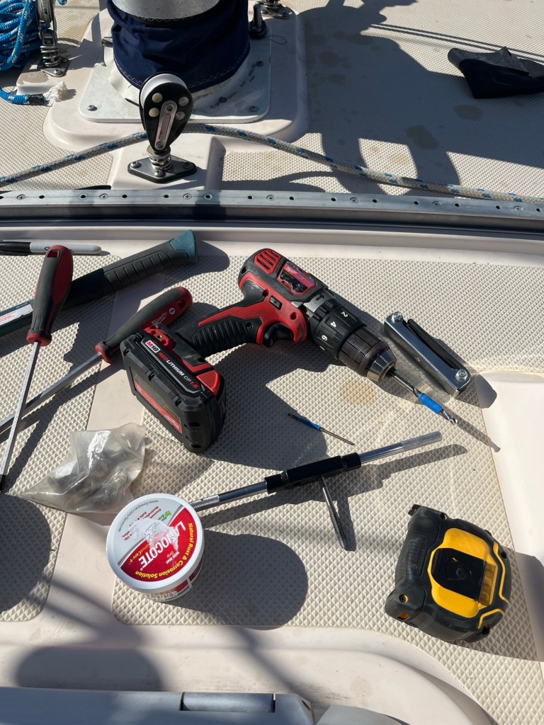 After I get all these holes drilled and tapped, I will remove the screws, remove the track and I will add some sikaflex between the mast and track. Then attach the track again with screws dipped in anti-corrosive material. AND REPEAT for the second track! But that is tomorrow! Goodnight!