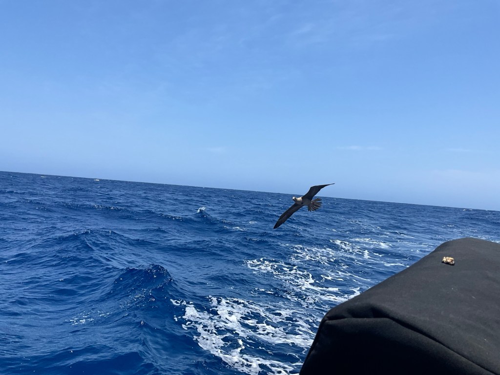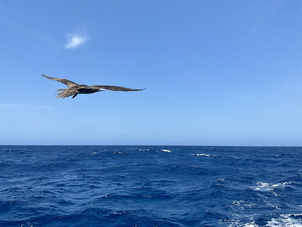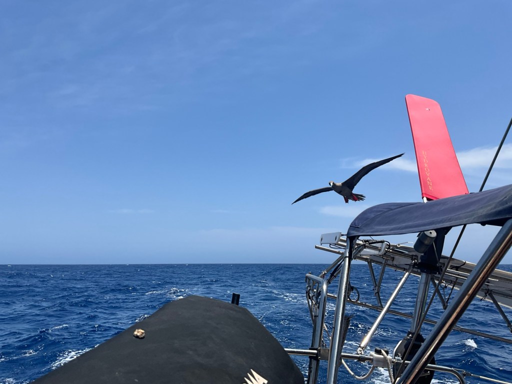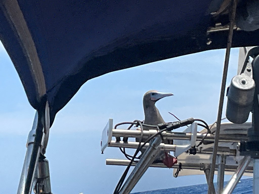 Ps. Male boobies are grey brownish in color with red feet, like the one on my boat. Female boobies are white with some black and also have red feet! I’ve witnessed female boobies circling around and fishing while the male is sitting here! He is probably waiting for dinner to be served!