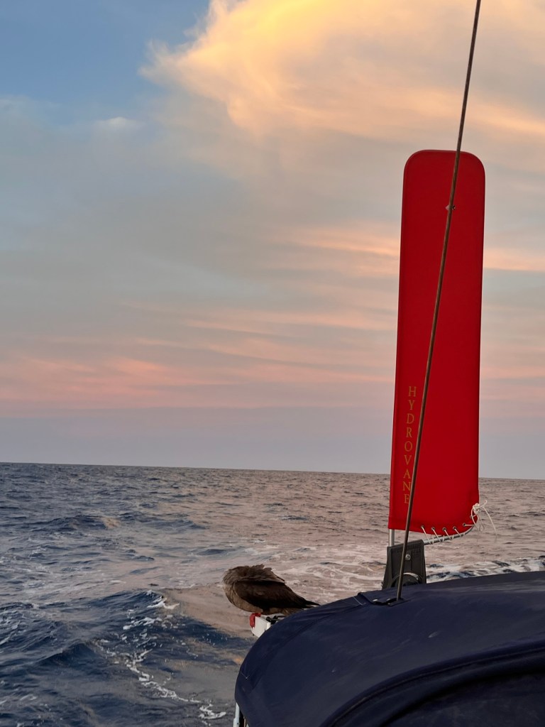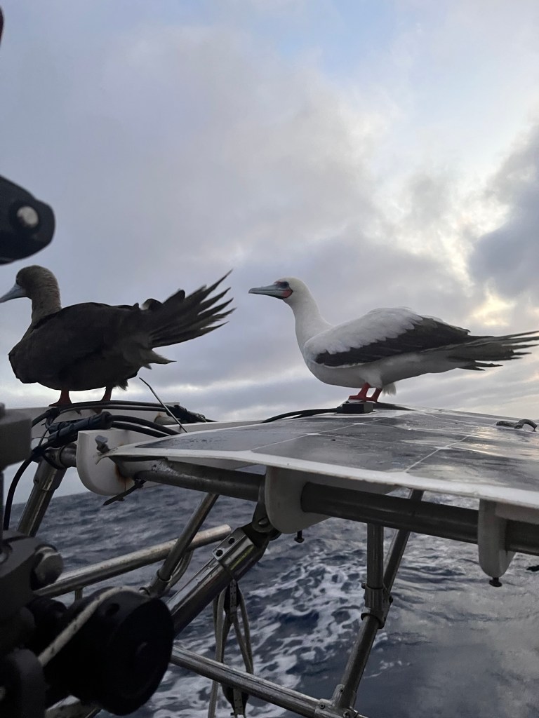 01.00 it is and my shift has started! I laid down for 4 hours, however slept zero minutes. Can’t say I’m excited about my shift tonight! As soon as I took over the helm, female red footed Boobie joined her partner on the solar panel, 4 feet away from the helm! They have been saying hello to each other by squeaking back and forth! They must be happy to be rejoined!