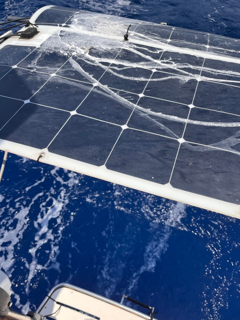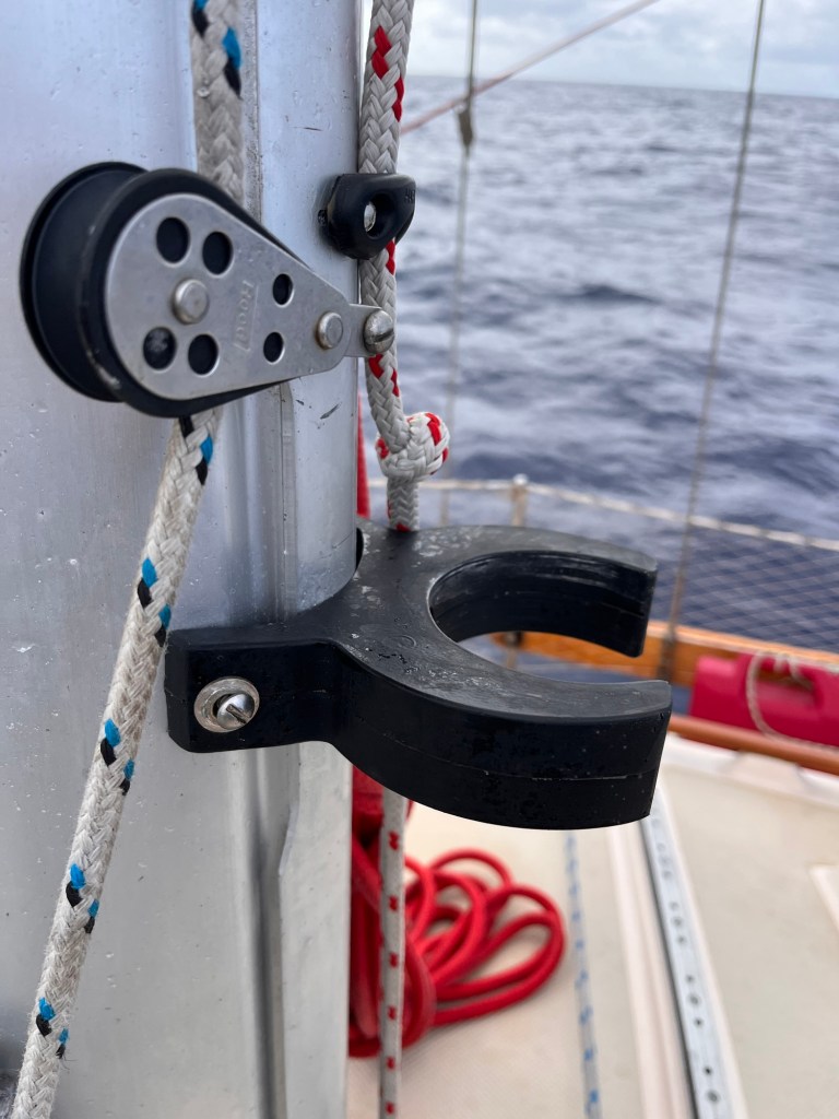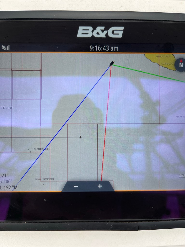 First thing this morning “let’s deploy that whisker pole” that caused us to delay our departure for 8 weeks! So, I reefed the main considerably to allow the head sail to have unobstructed wind, took the pole out of the chalk (rubber holder on bottom of track), tugged on the topping lift to allow some height and slowly raised the pole and pulled out the sail. Hmmm, should we telescope the pole more. Na, it seems happy for now!