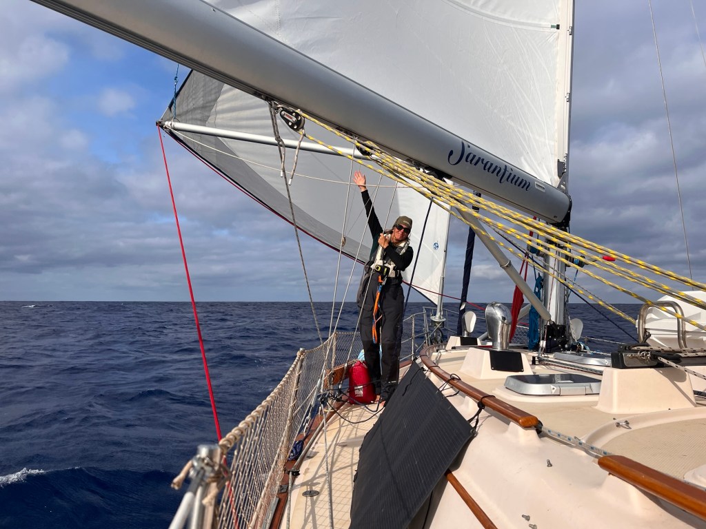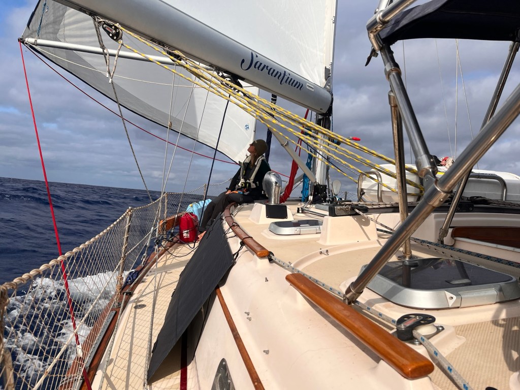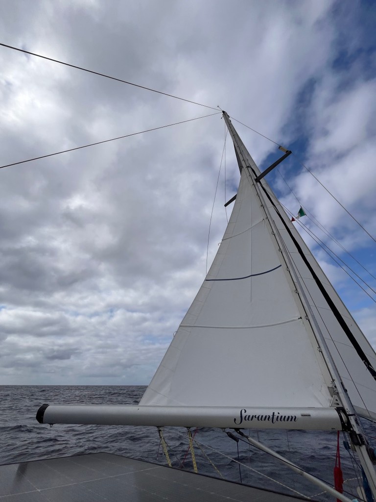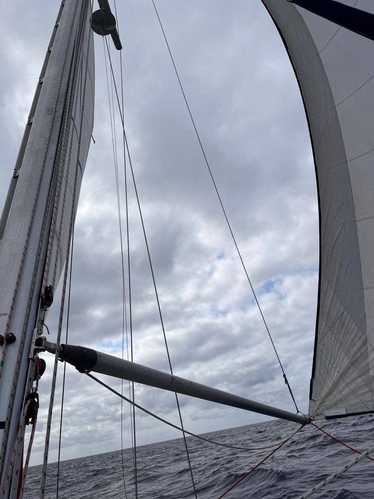 The night was quiet! Wind and waves were decent! I slept inbetween the million things that wakes one up on a sailboat making a passage! I thought about deploying the whisker pole during the night but decided against it and to wait til day light. Therefore I kept a more western heading to allow sails to be on a beam reach.