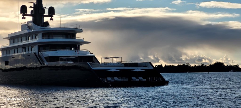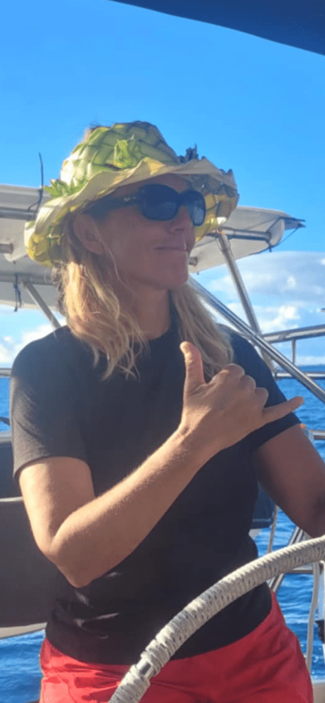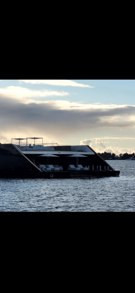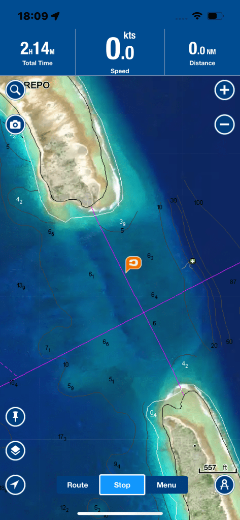 A pleasure boat, with a helicopter on the roof motored right towards us so I tacked away from it… and then it also changed direction. I decided to call them to see what their intended destination was; to continue past me or to go into the pass entrance. They answered and said they were heading into the pass. “Ok, I’ll tack back to original direction then as it’s too early for us to enter the pass with large standing waves” they answered “oh, is the tide going in or coming out right now?” 😳… this is when you know you got a big boat. How do you not know??? …tide was ebbing and current running MAX at 6 knots. I said “ looks like your boat can handle the standing waves, I’m waiting until slack, see you in there” ha! The captain laughed and said “have a great sail”I was amused to watch them go in and to see them slow right down as they too was affected by the strong current! An hour and a half later I set my engine to full speed and we surfed in on the large surf waves! That was fun!! I zigzagged in between corral heads and sand banks and finally anchored in 5 m off water! Another great day!!