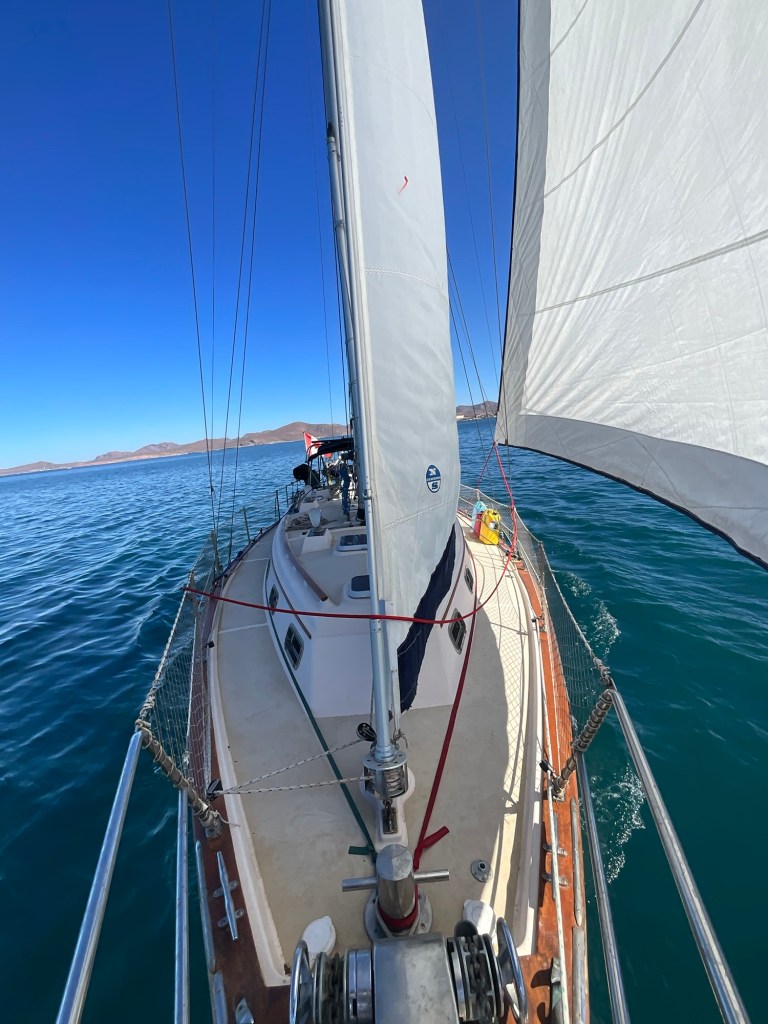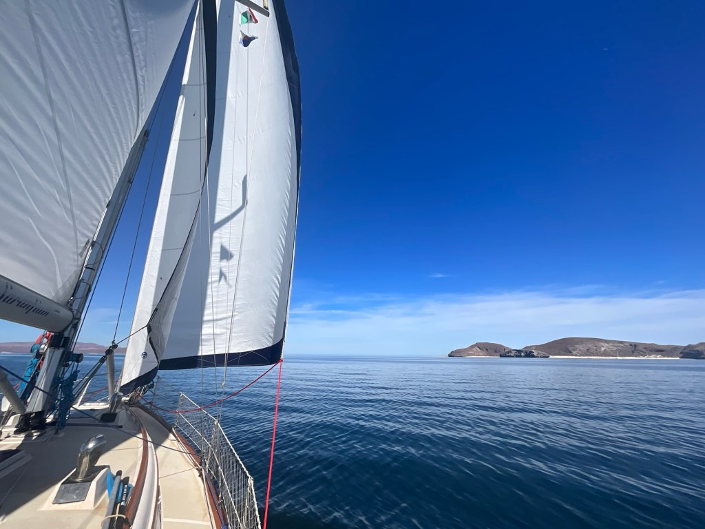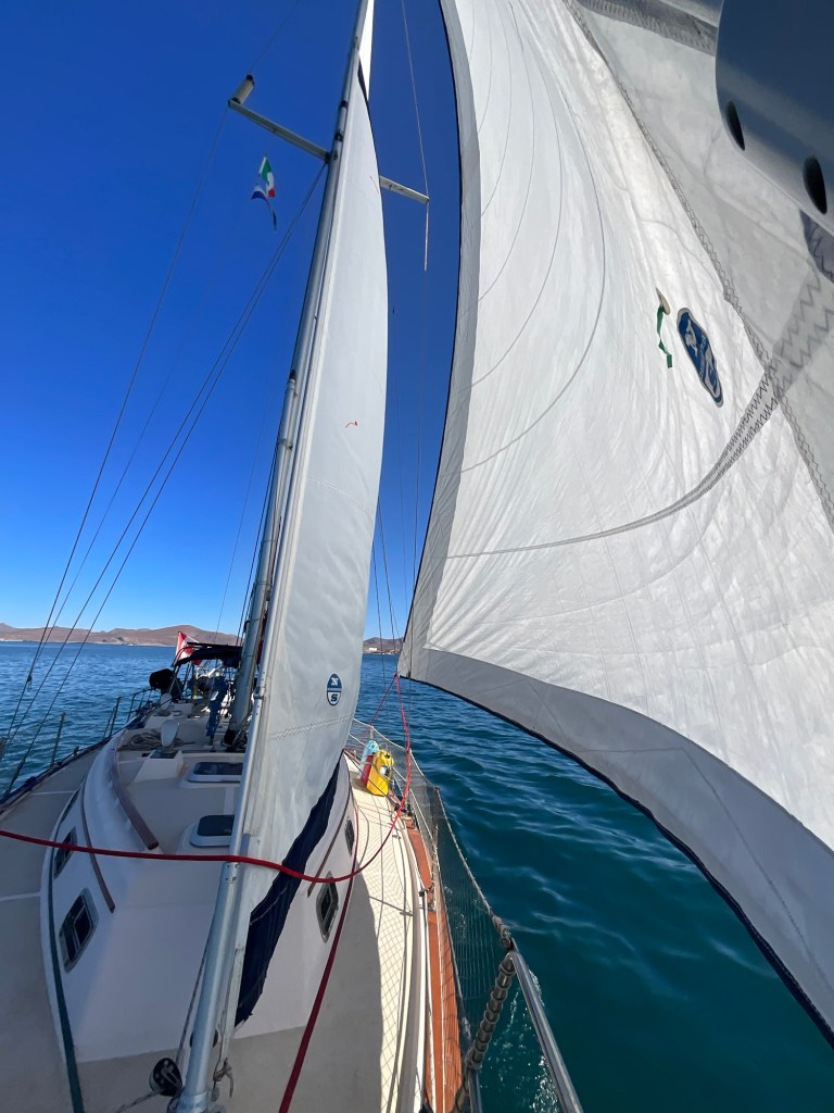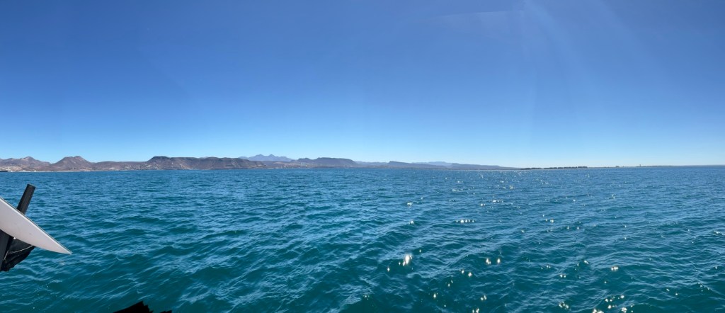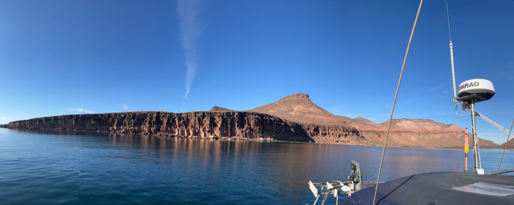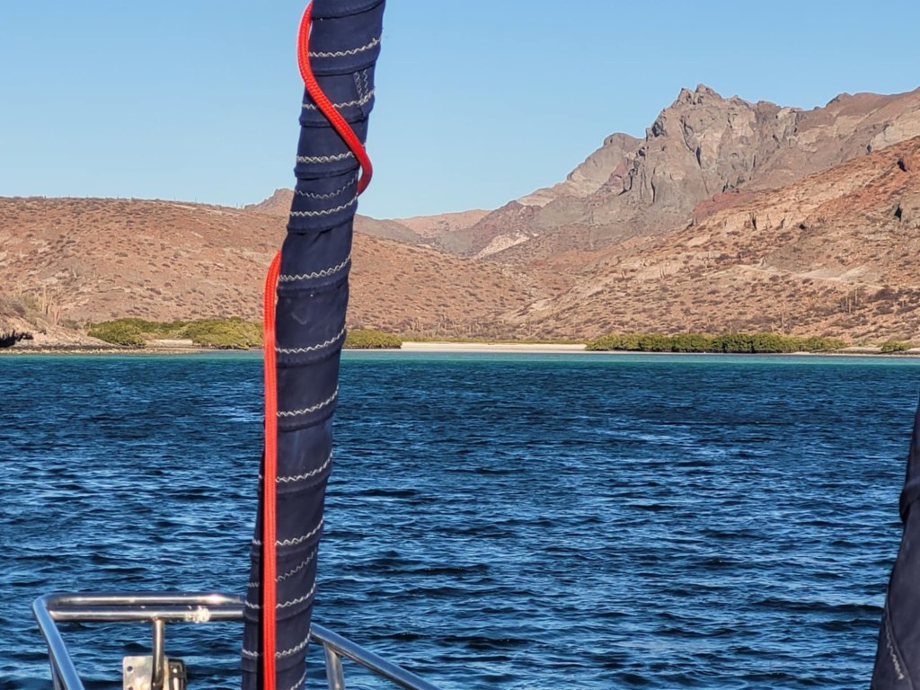 As there were no wind, I decided to pull my wetsuit on and scrape the growth off the hull! Wind kicked in and it is time to pull anchor and leave mainland Baja!