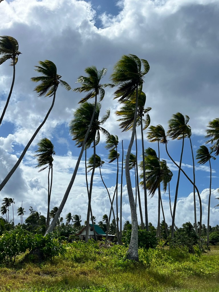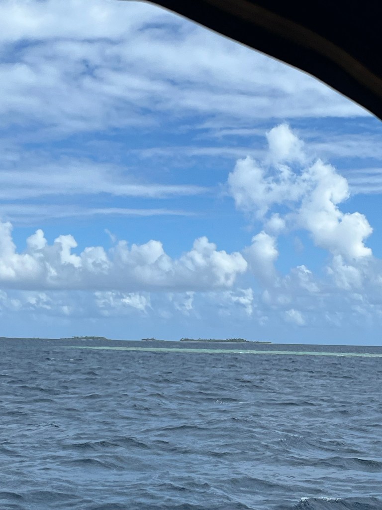 …and the Mekemo atoll. What an easy night. We averaged 5.5 knots and didn’t have to tweak the sails much after they were reefed in the late evening. None of the surrounding dark clouds had any rain or much wind… just gentle trade-winds! I am not entirely sure how much sleep I had throughout the night. I seem to have lost ”SV Joint Venture” on my plotter. I did hail them last night as I had notice they had slowed down considerably and we were still going 7 knots. They had slowed to 5.5 compared to their normal 9.5. Their cat measures 14mx7m so it can fly on the water. Since they go so fast they need to slow down so the will reach their atoll at daybreak rather than in the dark.