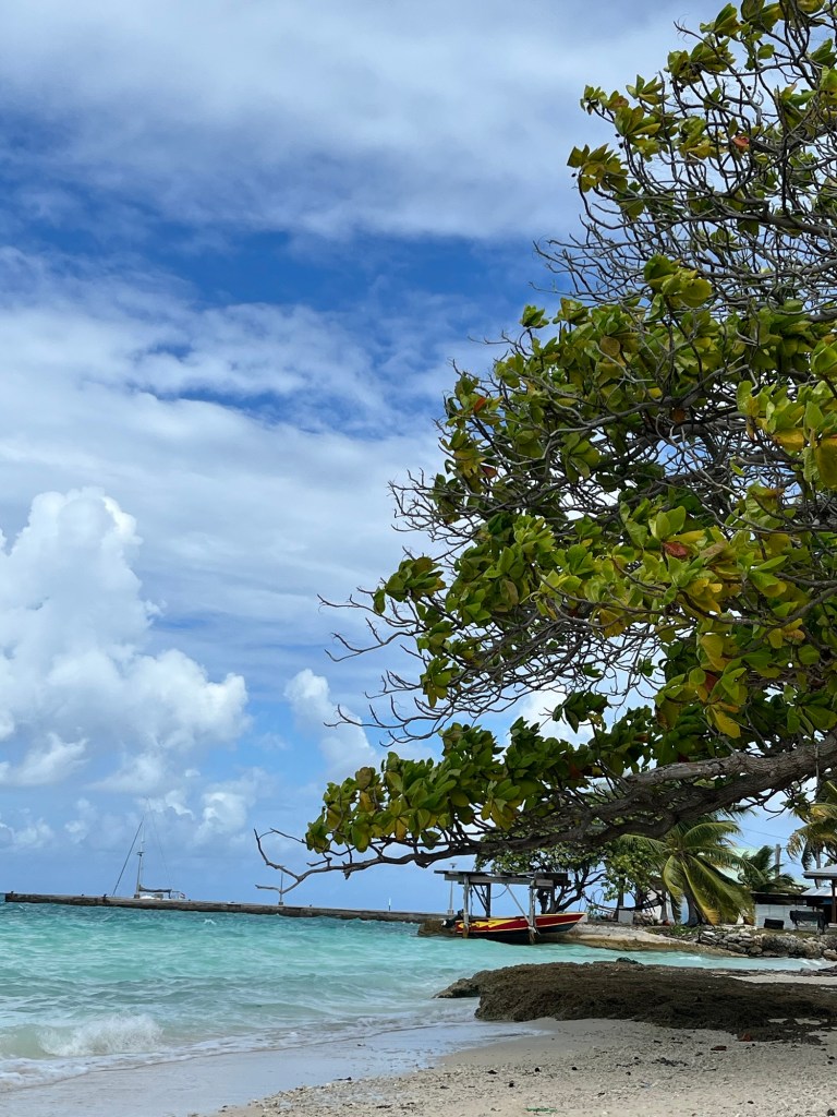 After 45 minutes to an hour, sailmasts appeared in the distance. We dropped anchor in 17 meters and swimming distance to a coral head. The water was unbelievably clear and even though trade winds were present, we had no swell. Although, I could see the the ocean on the outside, the reef around blocked the big swell and Sarantium laid still.